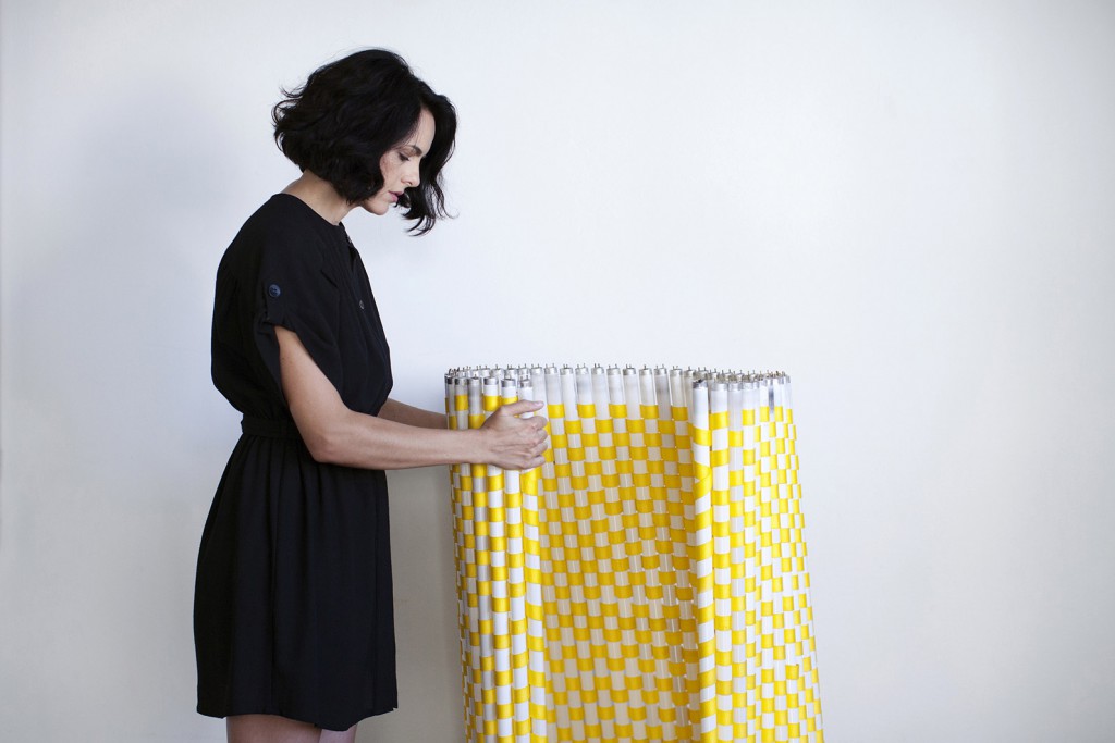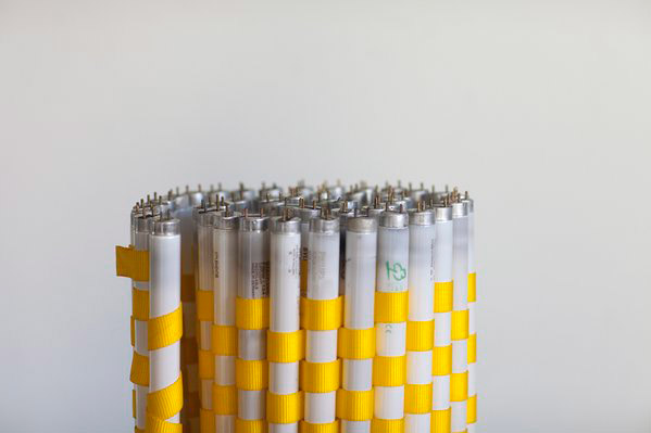 “[…] the grid becomes the vehicle for investigating the language of mathematics and technology of their era as well as of a constant critical review of the relations between physical and digital object, material and immaterial production, manual and intellectual labour.[…] Taking the theme into the present day, where digital technology invades every aspect of our lives, Efi Spyrou weaves spent fluorescent lamps together with bright yellow, heavy duty straps to create a series of nine graphic, abstract wall hangings called Metamorphoses, 2014;”